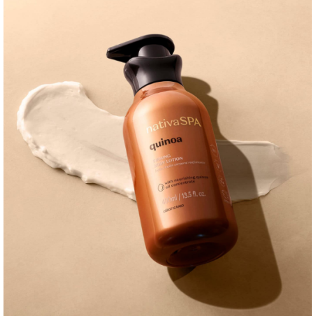 La loción corporal reafirmante de quinua Nativa Spa, 400 ml hidrata profundamente y nutre la piel.